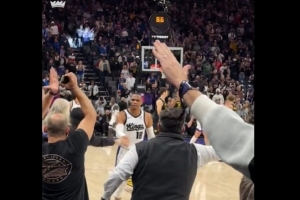 賽后,威少轉發了自己和場邊球迷慶祝的視頻,并寫道:“Why not(威少名言)?!”