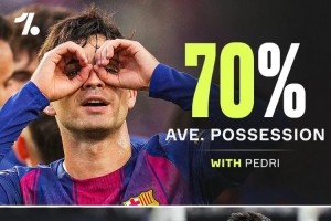 Onefootball統計了佩德里本賽季在場和缺陣時巴薩的控球率。佩德里本賽季出場時巴薩平均控球率70%,他缺席時巴薩平均控球率為50%,降低20%。