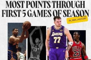 在賽季的前五場(chǎng)比賽中,東契奇合計(jì)得到200分,歷史第三高,僅次于張伯倫的兩次表演,詳情如下: