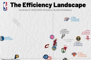 體育資訊11月7日訊 今天,數據專家Kirk Goldsberry更新了本賽季球隊的攻防效率值表。