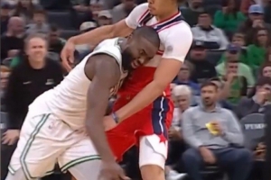 發際線粉事件之一:對陣奇才時杰倫·布朗發際線粉粘到對手白T上
