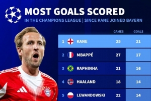 體育資訊9月18日訊 據(jù)德國轉會市場統(tǒng)計,凱恩加盟拜仁以來出戰(zhàn)25場歐冠比賽,打進21球,他是同期歐冠進球最多的球員。