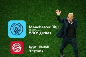 此役將是瓜迪奧拉執教生涯帶隊參加的第1000場比賽,曼城官方社媒曬出瓜帥執教場次的分布。