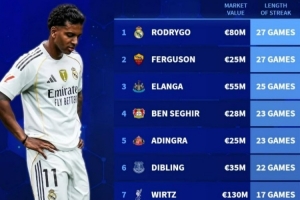 體育資訊11月8日訊 德轉(zhuǎn)盤點(diǎn)了目前遭遇進(jìn)球荒的攻擊手,其中羅德里戈27連續(xù)27場(chǎng)進(jìn)球荒居首,以下為具體情況(只統(tǒng)計(jì)身價(jià)2500萬歐以上球員):