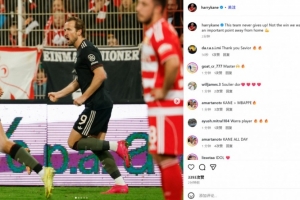 凱恩也在賽后通過社媒曬出自己進球后的慶祝照,并配文:“這支球隊永不放棄!沒拿到我們想要的勝利,但從客場帶走重要一分??”。