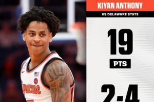 此役,卡梅隆·安東尼之子、雪城大學(xué)后衛(wèi)基揚(yáng)·安東尼迎來大學(xué)生涯第一次首發(fā),他表現(xiàn)十分高效,全場上陣29分鐘11投8中,三分4中2、罰球4中1,砍下19分3籃板4助攻1搶斷,沒有失誤。