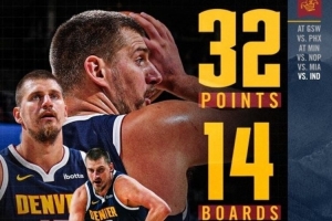 本場比賽,掘金球星約基奇在32分鐘的時間里,投籃14中10,三分球1中1,罰球12中11,砍下32分14籃板14助攻1搶斷。