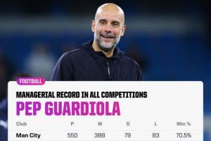 執教生涯1000場比賽,瓜迪奧拉取得了716勝156平128負的戰績,勝率超過7成。