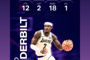 昨天湖人客場102-122不敵老鷹,5連勝終結。范德比爾特出戰28分鐘,9投4中,三分2中1,罰球3中3砍下12分18籃板2助攻1搶斷1蓋帽,籃板湖人生涯新高。