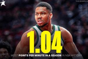 此役過后,雄鹿當(dāng)家球星揚(yáng)尼斯·阿德托昆博本賽季場均得分上漲至33.8分,場均出場時(shí)間為32.3分鐘,他上場每分鐘能得到1.04分,追平了NBA歷史記錄!
