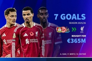 利物浦在今夏共計(jì)花費(fèi)3.65億歐元基礎(chǔ)轉(zhuǎn)會(huì)費(fèi)引進(jìn)了維爾茨(勒沃庫(kù)森)、埃基蒂克(法蘭克福)、伊薩克(紐卡斯?fàn)枺?人至今共計(jì)貢獻(xiàn)7球5助攻。