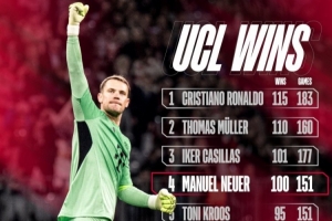體育資訊9月19日訊 拜仁在昨晚的歐冠焦點戰3-1力克切爾西,諾伊爾成為歷史第4位歐冠100勝球員。拜仁官方也列出了歐冠歷史勝場榜紀錄。