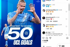 在社交媒體上,哈蘭德曬出了自己最快達成歐冠50球的海報,顯然這樣的成就令曼城射手非常自豪。