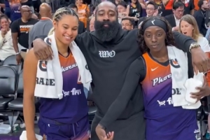 本場(chǎng)比賽,快船球星詹姆斯-哈登現(xiàn)身場(chǎng)邊觀戰(zhàn),賽后他還與水星球員薩巴利和庫(kù)珀擁抱慶祝。
