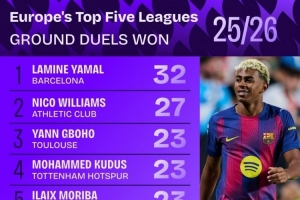 體育資訊9月12日訊 Squawka統計了本賽季球員在五大聯賽的地面對抗成功次數,并列出榜單。