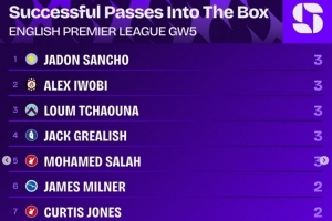 體育資訊9月24日訊 英超第5輪戰罷,squawkafootball列各項數據排行,桑喬等5名球員3次成功將球傳入禁區,為本輪聯賽最多。