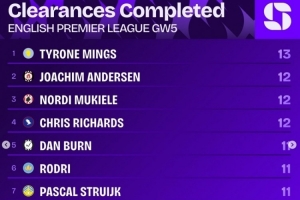 體育資訊9月24日訊 英超第5輪戰罷,squawkafootball列各項數據排行,維拉后衛明斯是本輪解圍最多的球員,共13次。