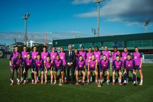 在體育城訓(xùn)練場上,巴薩女足球員們與俱樂部官員哈維爾-普伊一起合影,身旁擺放著三項(xiàng)重要獎(jiǎng)杯:邦馬蒂連續(xù)第三次獲得金球獎(jiǎng)、維姬-洛佩茲贏得首屆科帕獎(jiǎng)以及埃瓦-帕喬爾榮獲首個(gè)蓋德-穆勒獎(jiǎng)。