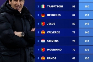 體育資訊9月25日訊 德轉盤點了歐聯杯歷史上主帥贏得積分最多紀錄,其中埃梅里居首,本賽季執教維拉的他是否能奪得個人第五座歐聯杯冠軍值得期待。以下為具體榜單: