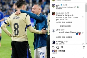 巴薩中場佩德里更新社媒動態,曬出與皇家奧維耶多40歲中場卡索拉的賽后合照,對其表達敬意,配文:“天才,能把你的球衣給我嗎?”