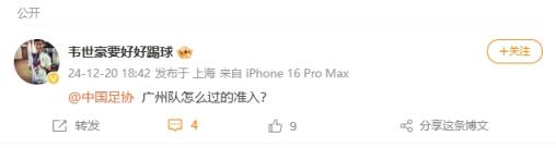 12月20日訊 韋世豪發聲質疑后,楊立瑜轉發韋世豪微博質疑足協準入。
