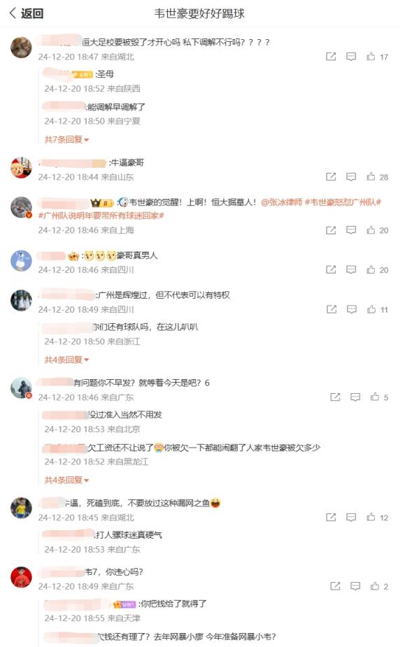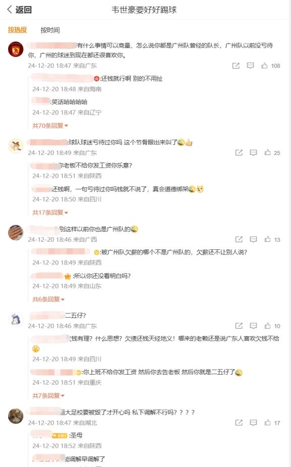 在韋世豪的微博評論區(qū)下充斥著兩種聲音,一種認為韋世豪當初也是廣州隊隊長,有什么事可以商量,另一種則認為俱樂部欠債還錢天經地義。你怎么看?