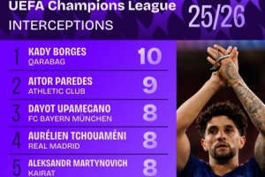 本賽季歐冠攔截榜:于帕梅卡諾&瓊阿梅尼各8次,加拉格爾7次