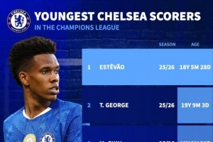 切爾西歐冠最年輕進球者排名:埃斯特旺居首,喬治、吉烏二三位