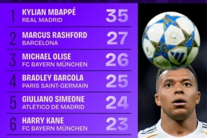 本賽季歐冠對方禁區內觸球次數榜:姆巴佩35次第一,拉什福德第二