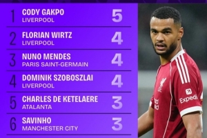 本賽季歐冠創造絕佳機會榜:加克波5次第一,維爾茨等3人4次