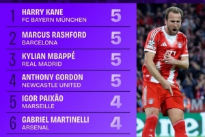 本賽季歐冠參與進球榜:凱恩、拉什福德、姆巴佩等4人均5球