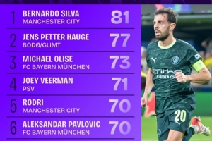 本賽季歐冠完成進攻三區傳球榜:B席81次第一,曼城4人上榜