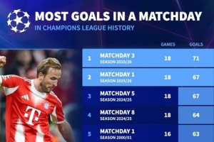 歐冠單輪進球數量榜:本輪18場比賽71球居首,本賽季首輪67球次席