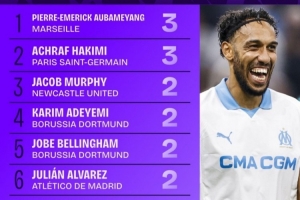 本賽季歐冠助攻榜:奧巴梅揚和阿什拉夫均3次,分列前二