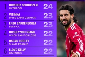 本賽季歐冠贏得控球權榜:索博斯洛伊24次第一,維蒂尼亞23次第二